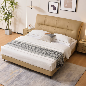 Cama grande de madera maciza de primera calidad, cama de tela ultrasuave Dove, cama de cuero genuino para dormitorio amarillo Luna